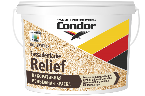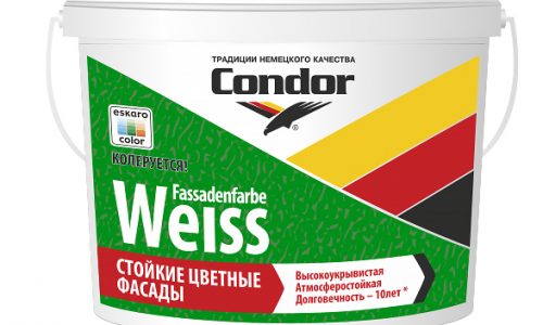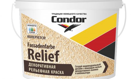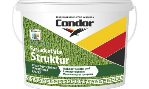 Condor Fassadenfarbe-Struktur – структурная краска, наполнителем которой является мраморная крошка. Применяется при внутренних и наружных работах. При помощи краски можно перекрыть мелкие щели и оптически выровнять стены. Четко выраженная структура краски изготовлена для декоративного окрашивания здания, образуя при этом атмосферостойкое и паропроницаемое покрытие.