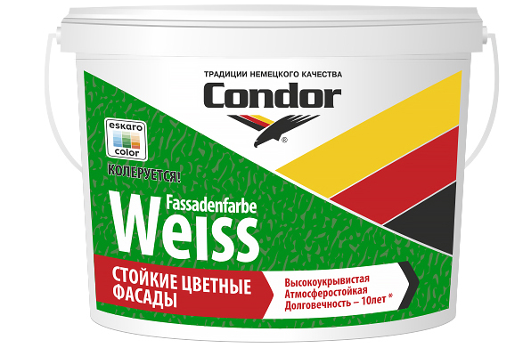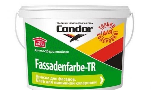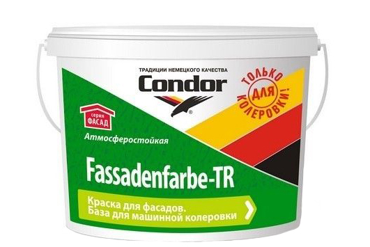 Condor Fassadenfarbe TR – краска, с акриловой основой отлично подходит для фасадных работ и для внутренних. Матовая краска подходит для колеровки в темных тоннах. Можно использовать в помещениях с повышенной влажностью. Окраска обладает высокой износостойкостью, высокой адгезией, устойчива к мытью. Наносить краску можно валиком, распылителем и кистью. Состав не содержит органических растворителей.