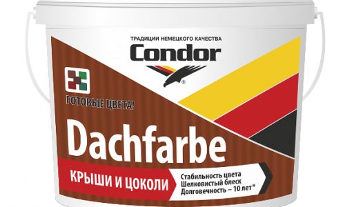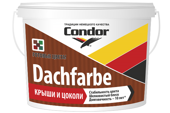 Condor Dachfarbe – предназначена для работ с такими покрытия как шифер, цоколь, черепица. Краска готовых цветов, благодаря входящим добавкам в состав защищает покрытие от биозаражения. Покрытие данной краской будет устойчиво к неблагоприятным атмосферным воздействиям. Подходит как для окрашивания новых крыш, так и для и требующих капитального ремонта старых. Также можно окрашивать при помощи данной краски гипсокартон и минеральные поверхности. Нанесение кистью и валиком.
