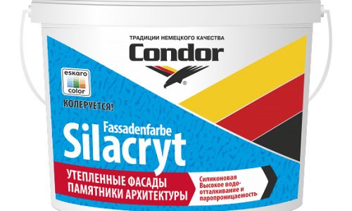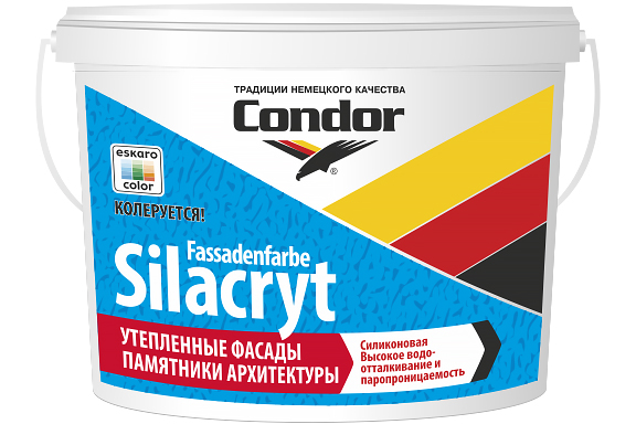 Condor Fassadenfarbe-Silacryt – матовая краска, которая содержит силиконовую эмульсию. Применяется при работах по реабилитации покрытий фасадов, прекрасно подходит при работах в помещениях с высокой влажностью. Данная дисперсионная краска применяется для работ на минеральных и ранее окрашенных поверхностях. Покрытие устойчиво к атмосферным воздействиям, соответствует стандартам качеств.